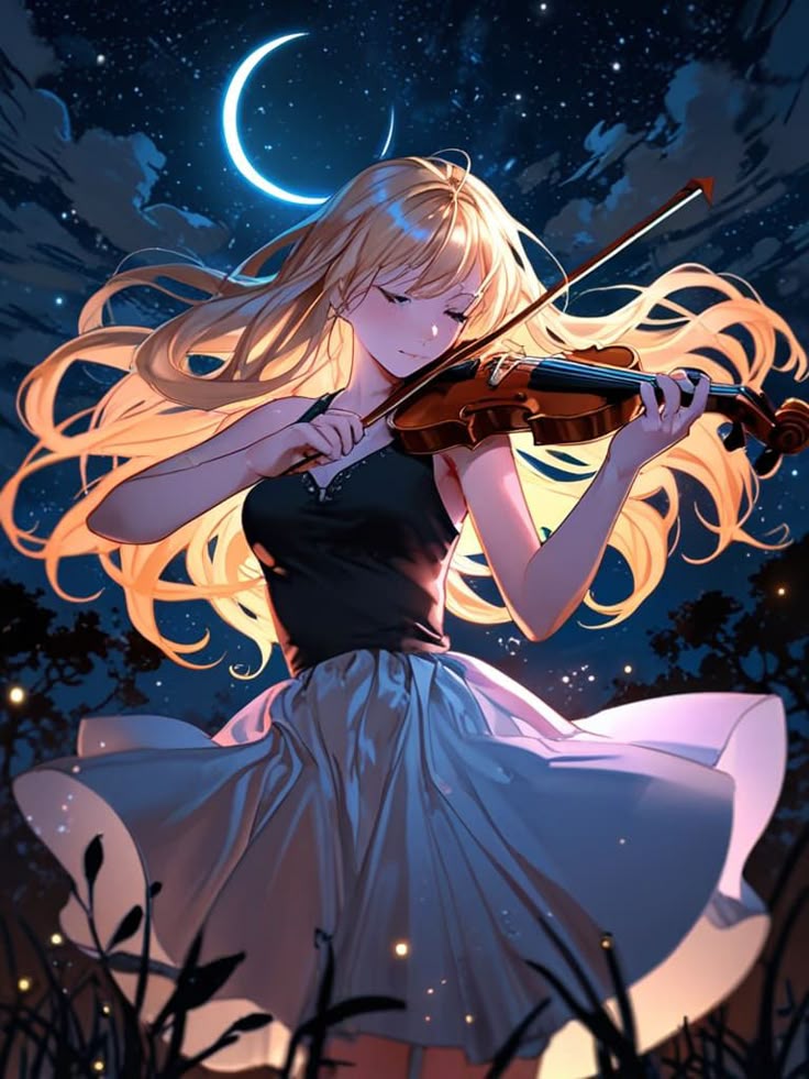 دختری با موهای طلایی در حال نواختن ویولن زیر هلال ماه و آسمان پرستاره؛ ملودی شبهای جادویی.