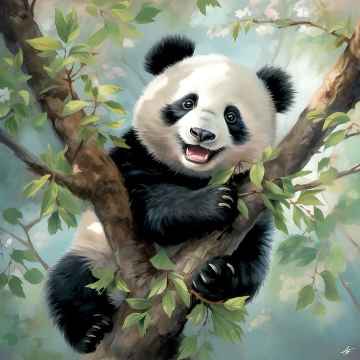 تصویری از یک پاندای بازیگوش و خندان بر روی شاخه درخت که شادابی و گاهی اوقات جنبه خنده داری از طبیعت را نشان می دهد.