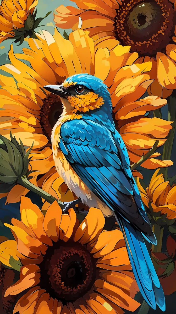 پرندهای آبیرنگ روی شاخهی گلهای آفتابگردان نشسته است؛ ترکیبی زنده از رنگهای زرد و آبی در نور روز.