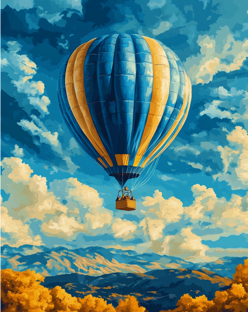 بالن رنگارنگی آرام از میان آسمان آبی و ابرهای سپید بالا میرود. فضای نقاشی سرشار از حس رهایی، رؤیا و ماجراجویی است.