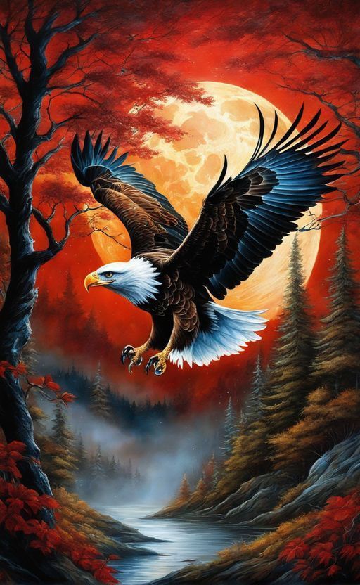 عقاب سرسفید در حال پرواز قدرتمند زیر ماه کامل قرمز، در میان جنگل آتشین و مه آلود؛ نماد آزادی و قدرت وحشی.