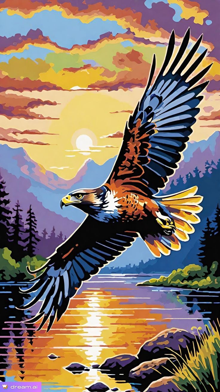 عقاب با بالهای گشوده در آسمان رنگارنگ طلوع، بالای دریاچه و کوهها؛ رقص آزادی در نور آخر روز.
