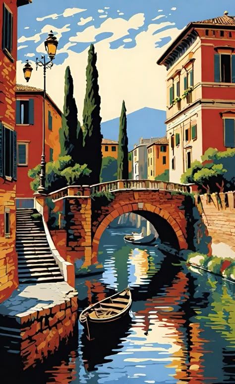 پلی آجری در کانالی آرام، احاطهشده با ساختمانهای گرمرنگ، درختان سرو و آسمان ابری؛ سفری رمانتیک در قلب ایتالیا.