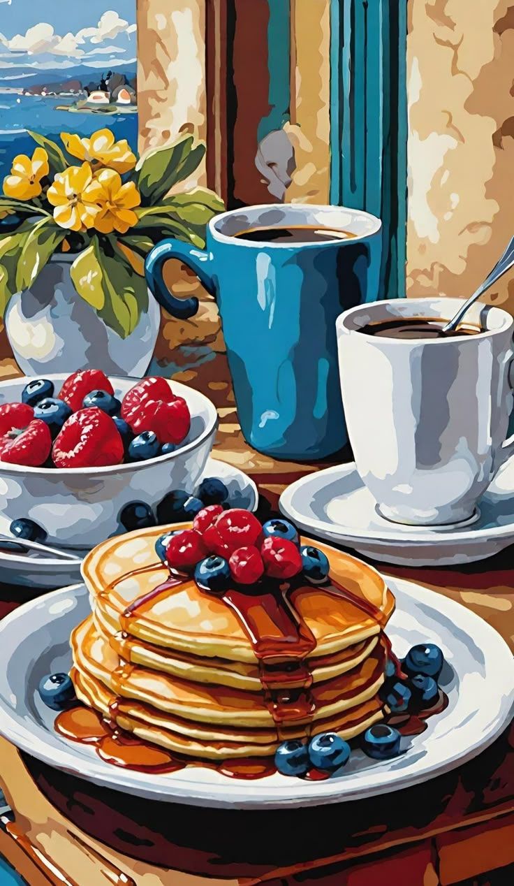 پنکیکهای طلایی با شربت و توتهای تازه، دو فنجان قهوه داغ و منظره دریا از پنجره؛ صبحانه رویایی تابستانی.