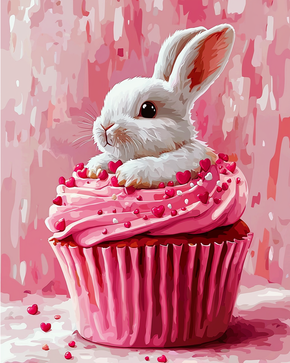 خرگوش سفید کوچولو روی کاپکیک صورتی پر از قلبهای ریز، در دنیای شیرین و صورتیرنگ.