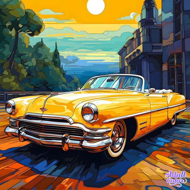 ماشین کروک زرد براق زیر آسمان غروب، کنار عمارت قدیمی؛ حس نوستالژی و آزادی.