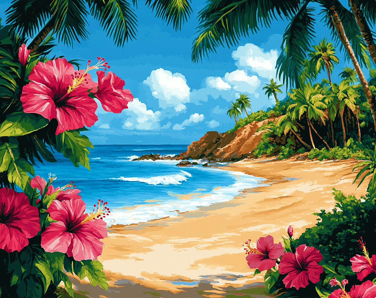 در میان برگهای نخل، گلهای هیبیسکوس سرخ زیر آفتاب درخشان در کنار ساحلی آرام میدرخشند.