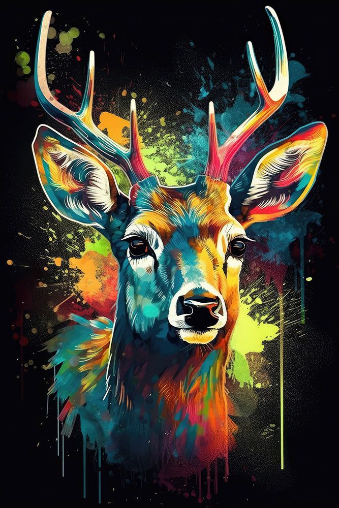 گوزنی رنگارنگ با شاخهای نورانی در پسزمینه سیاه کهکشان، مثل روح جنگل در فضای بینهایت.