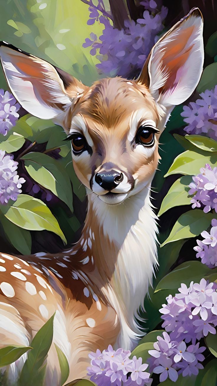 گوزن کوچکی در میان بوتههای یاس بنفش، نگاهی از مهربانی و آرامش در دل طبیعت.