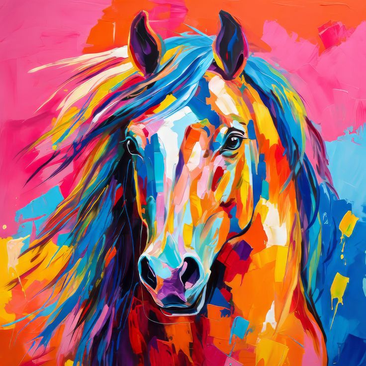 تابلوی انتزاعی زندهای از یک اسب که با ضربهقلمهای پرانرژی و رنگهای درخشان آبی، نارنجی، صورتی و زرد جان گرفته است.