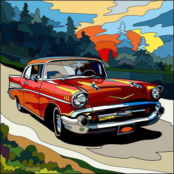 شورلت کلاسیک قرمز در جاده جنگلی با غروب آتشین، درختان کاج و آسمان موجدار؛ نماد آزادی آمریکایی.